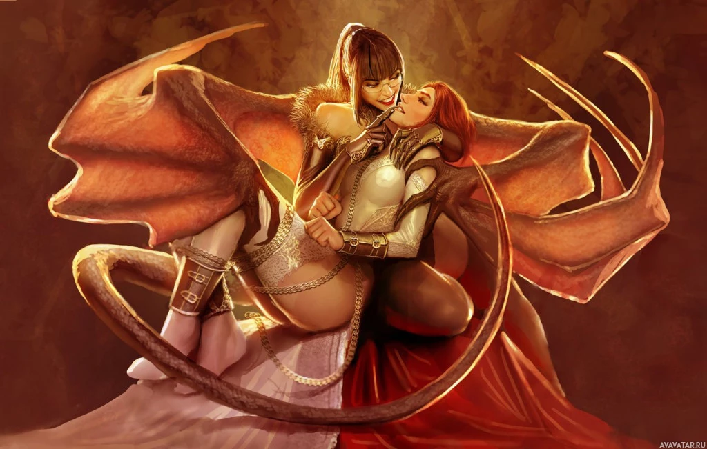 a fantasy setting, with dark tones and warm lighting that suggests they might be interacting in a magical or supernatural realm. The succubus is characterized by her demonic features, such as wings and a tail, while the other figure has more seraphic attributes like feathered wings and halo-like symbols around her head. They are embracing each other, which may suggest
