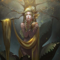 The image depicts a fantasy-style artwork featuring a character that appears to be a dryad, which is often associated with