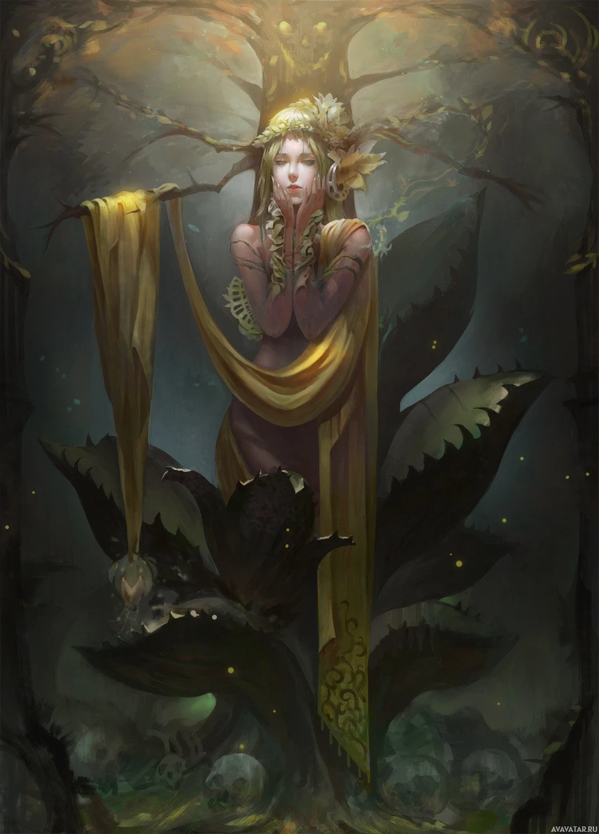 mythical beings that are connected to trees. The central figure is female and has