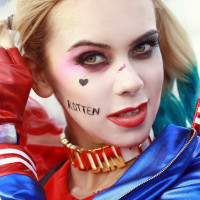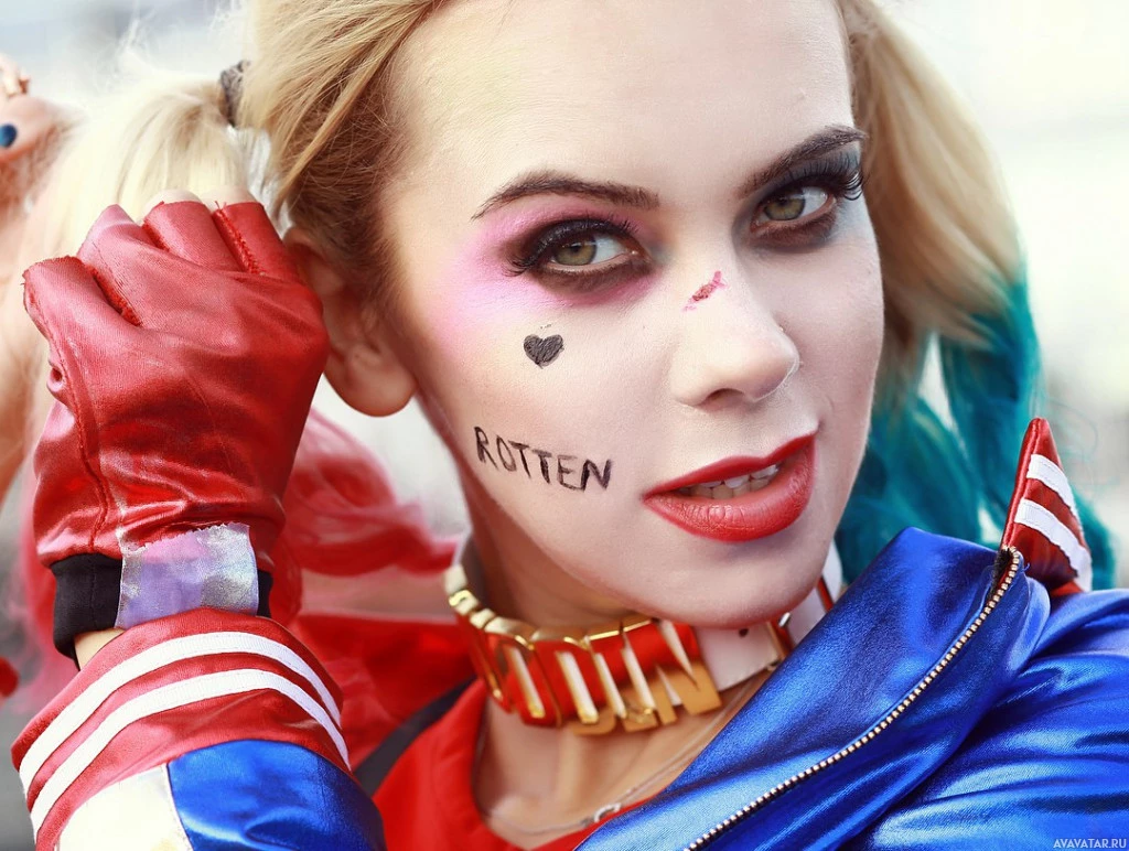 Harley Quinn, a character from the "Suicide Squad" comics and movies. They are wearing a costume with distinctive features such as a red and blue outfit, white face paint, pink lips, and black