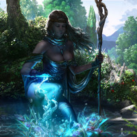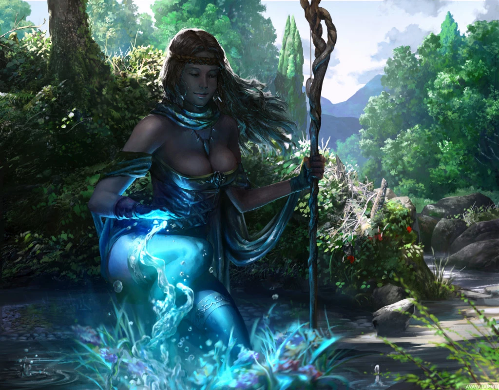 fantasy depictions of such characters. The setting includes natural elements like water and trees, which contributes to the atmosphere of the scene being in a mystical or enchanted forest.