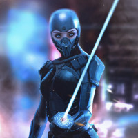 a humanoid form, dressed in armor with metallic sheen and is holding a sword with her other hand. The environment around her suggests