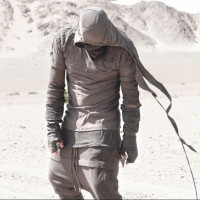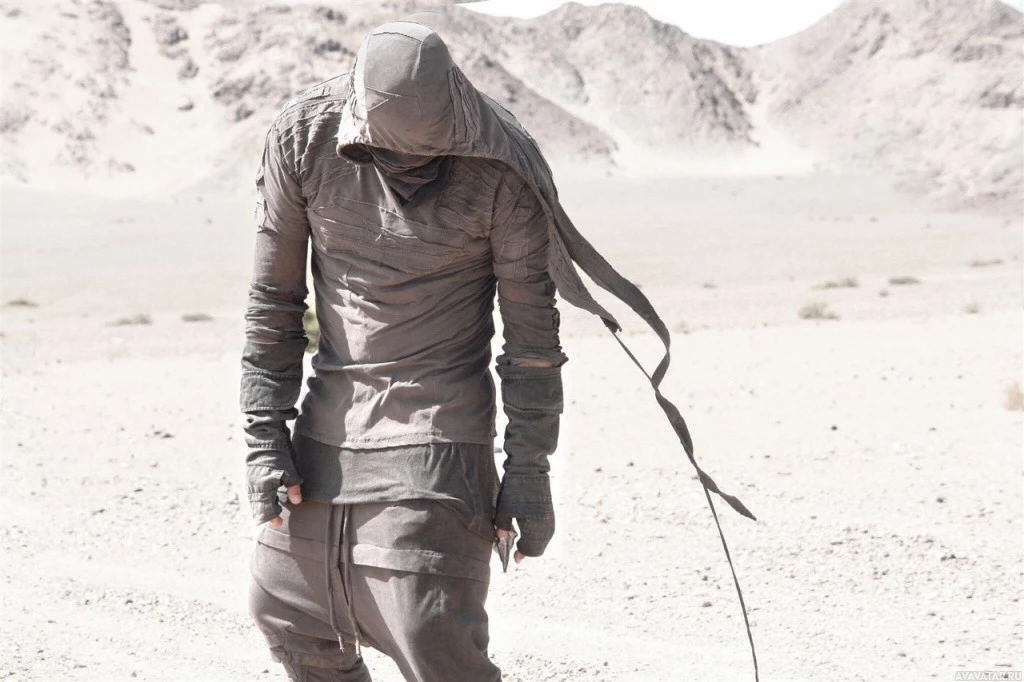 desert environment, possibly the Sahara or a similar landscape. The individual is wearing a hood and appears to be dressed in camouflage clothing that may suggest they are in military attire or outdoor