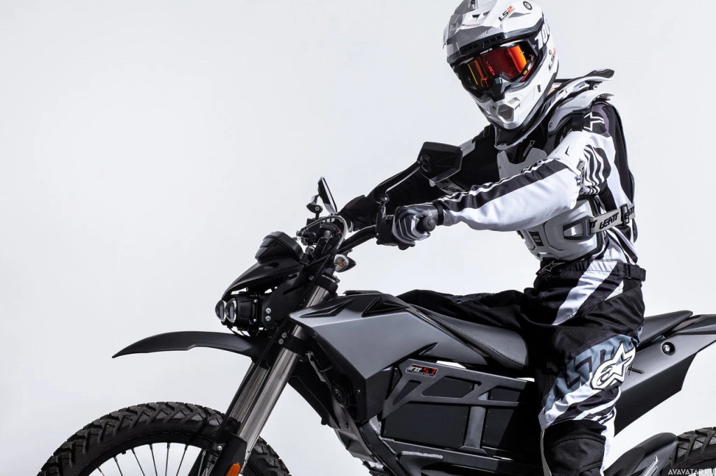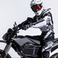 a sleek design, indicative of high-performance models. The rider is dressed in