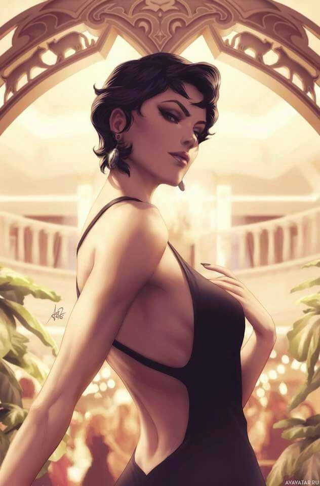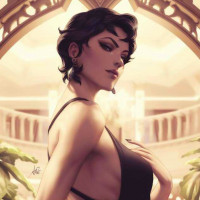 elegant decorations. The character is drawn in a stylized manner typical of comic book artwork or conceptual illustration for