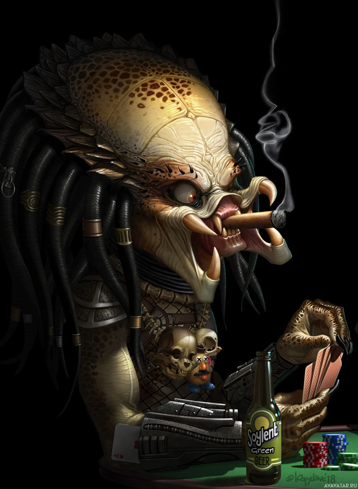 На картинке изображен анимированный персонаж, напоминающий Хищника из франшизы фильма «Чужой». Он изображен курящим сигарету и держащим в руке карту, сидящим за столом с игральными картами. Есть также бутылка алкоголя с надписью «Хищник», которая добавляет тематической связи персонажу из серии фильмов.