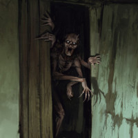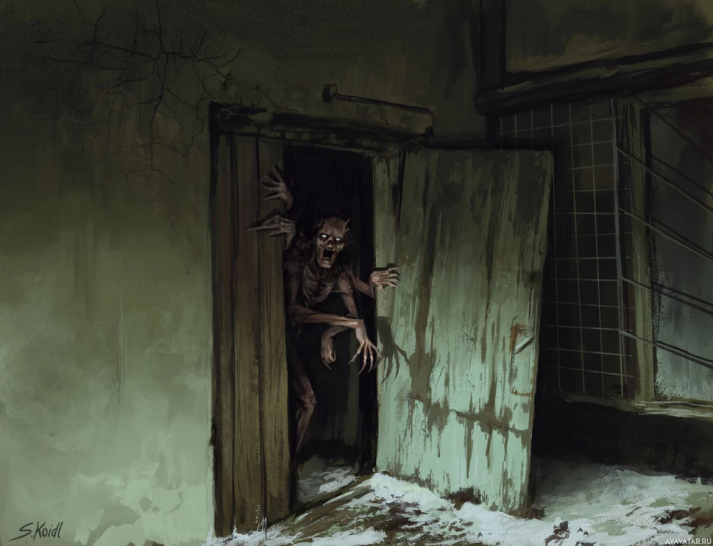 Картинка показывает сцену ужаса с монстром или существом, появляющимся из ветхого здания. У существа острые зубы и агрессивная осанка, предполагая, что это может быть вампир или какая-то другая мифическая кровососущая сущность. Сеттинг выглядит мрачным и предчувствующим, что согласуется с жанром ужасов образа.