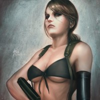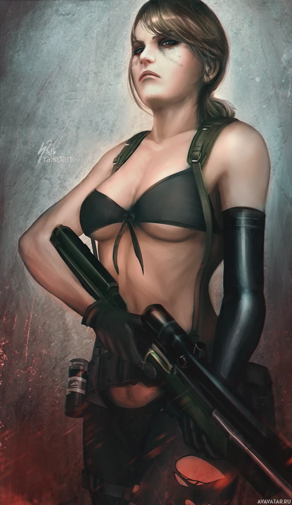 the video game "Metal Gear Solid V: The Phantom Pain." She is depicted in a pose that suggests