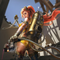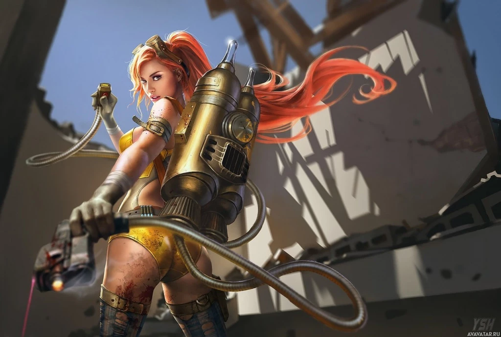 a female character with red hair. She is holding a weapon that resembles a bow and arrow, which could be an element of her fantasy or adventure theme. She also has some