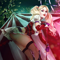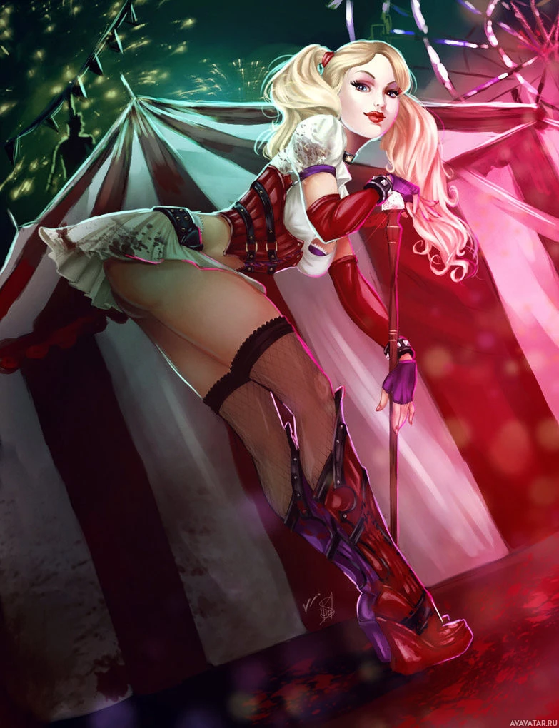 blonde hair, pigtails, red and black clothing with ruffles, knee-high boots, and baseball bat, which she is holding behind her back. The background suggests an eerie or ominous setting with a tent that appears to be part of a carnival or circus theme. This artwork captures