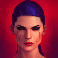 blue hair and vivid red eyes. Her expression appears contemplative or sad, enhanced by the presence of what seems to be a tear falling from her left eye. The overall color palette is quite bold and dramatic, with a deep