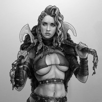 The image shows a character dressed in what appears to be fantasy or warrior-themed armor and costume. She has a fierce expression and is holding what seems to be an axe. The drawing style suggests it could be part of a comic book, graphic novel, or video game artwork.