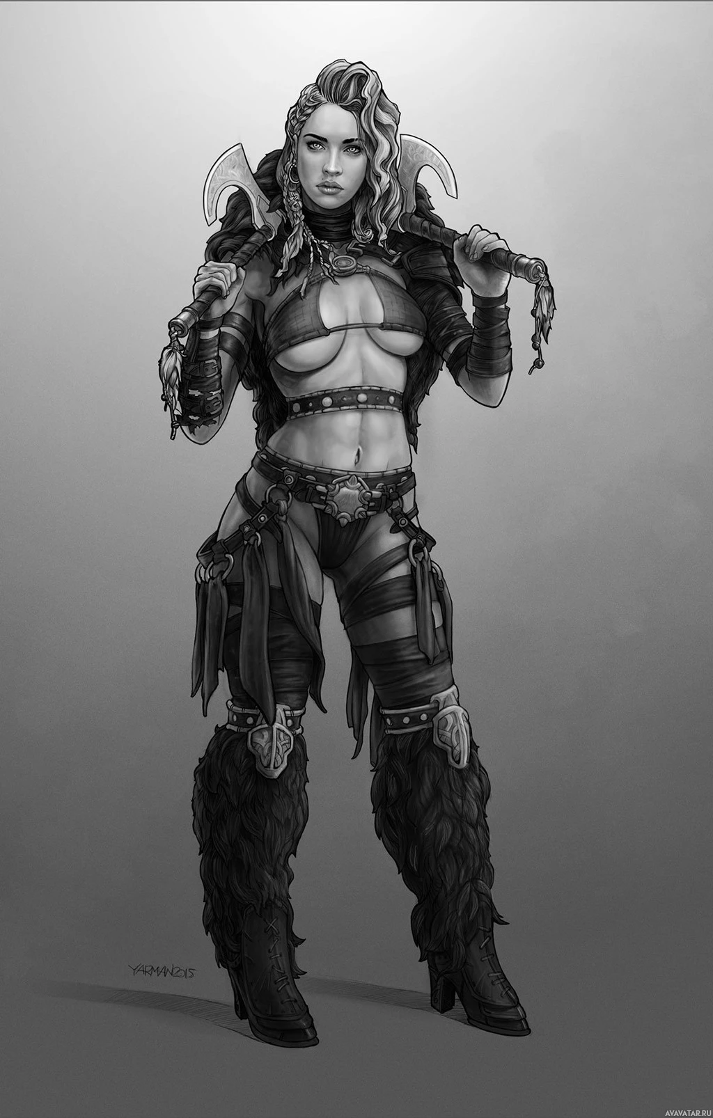 На картинке изображен персонаж, одетый в то, что кажется фэнтези или доспехами и костюмами на тему воина. У нее свирепое выражение лица и она держит топор. Стиль рисования предполагает, что он может быть частью комикса, графического романа или произведения искусства видеоигр.