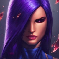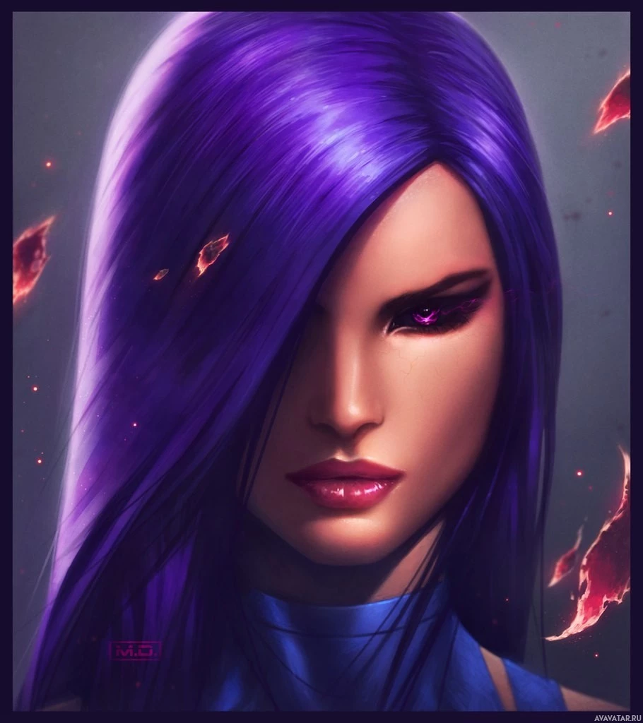 purple hair and is looking directly at the viewer with her lips slightly parted in a neutral expression. Her eyes have a subtle,