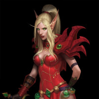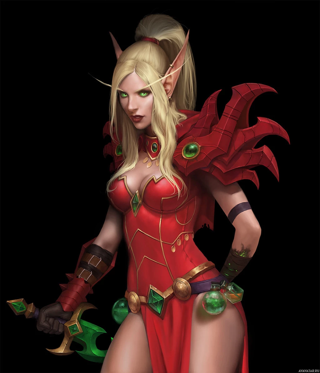 red dress with gold accents, including armor pieces on her shoulders and chest that seem to be made from skulls or other ornate designs. In each hand, she holds a weapon: a sword in the left and what appears to be a mace or staff in the right. The overall impression is of a powerful warrior-