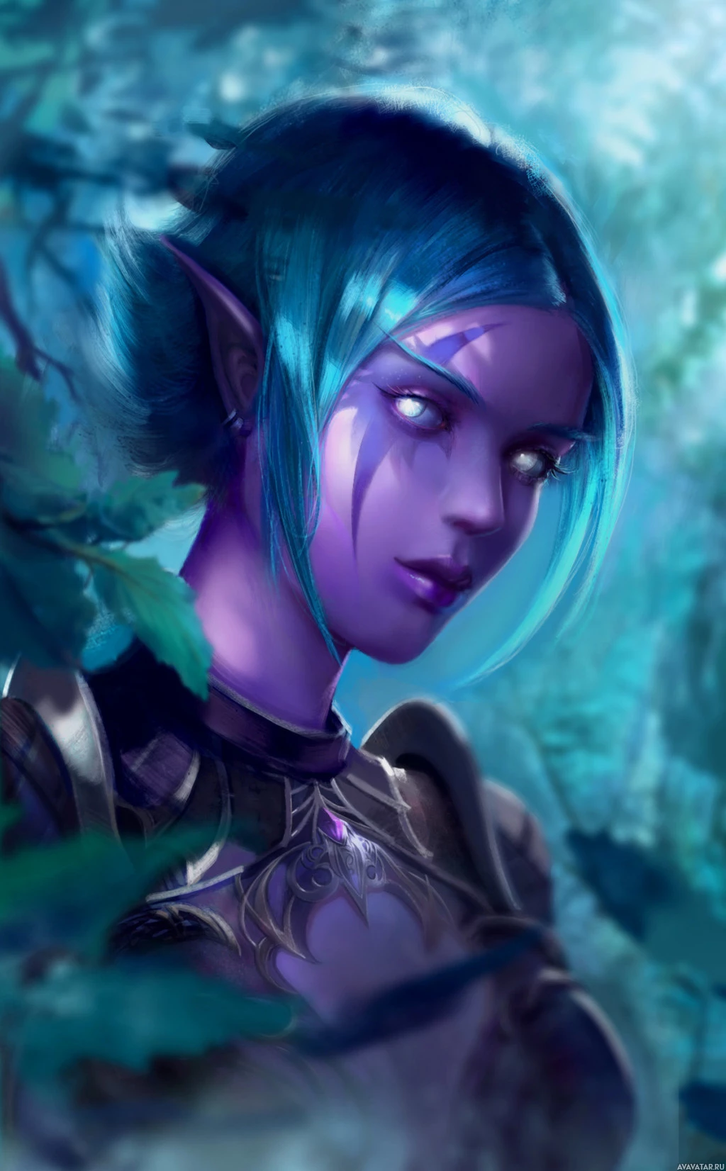 blue hair and is wearing an armor piece that appears to be inspired by elvish or dark fantasy designs. The background features what looks like