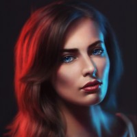 cool blues and purples around her face, while the background fades into warmer tones. This image could be interpreted as a piece of digital art or illustration rather than a photograph due to its stylized appearance and the use of high contrast colors.