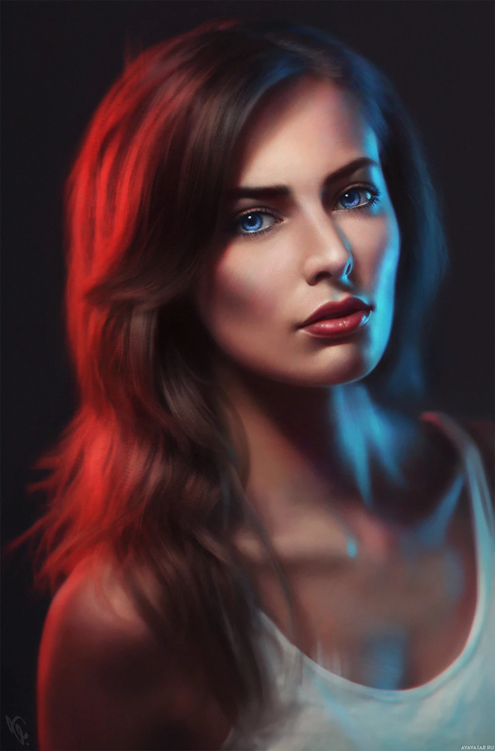 long hair, parted to the side, and striking blue eyes that seem to be glowing. Her skin tone is warm, and she appears to have
