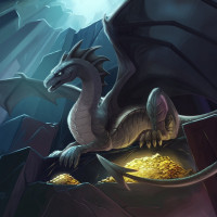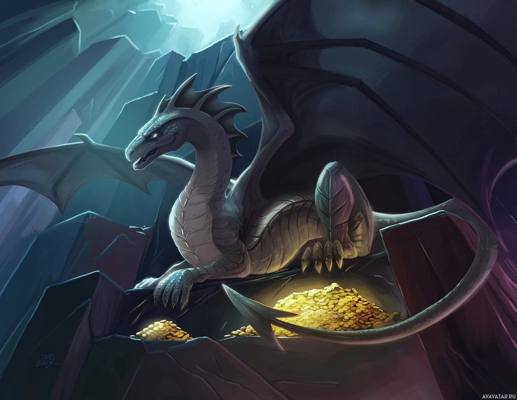 gold coins beneath the dragon, which could suggest a treasure hoard or a scene from folklore where dragons are associated with such riches. The background shows rocky cliffs or walls under