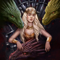 the fantasy universe, possibly referencing a scene from "Game of Thrones" where Daenerys Targaryen, the Mother of Dragons, is depicted with her dragons. The artist has signed the bottom left corner of the artwork. The use of
