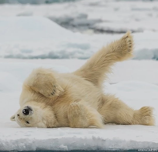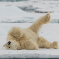 polar bear lying on its back in what appears to be a playful or relaxed manner. The bear's
