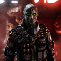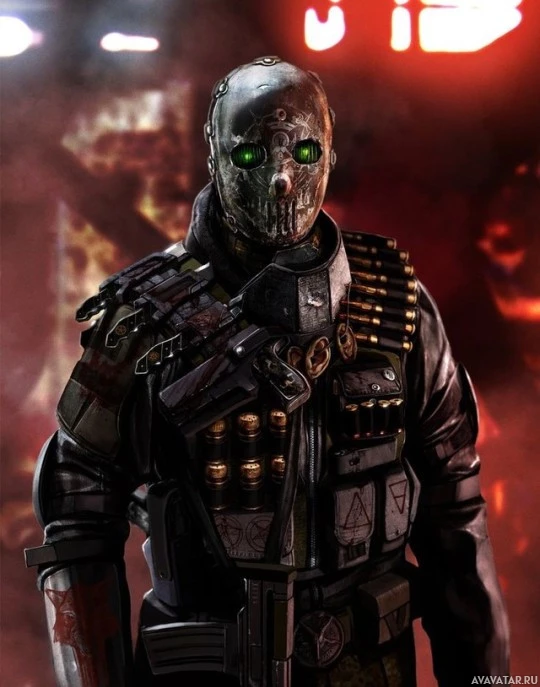 augmented eyes glowing green, which suggests that this character might have advanced technological features. The soldier is also holding a weapon with its hand, indicating readiness for combat or action. The setting includes a backdrop of