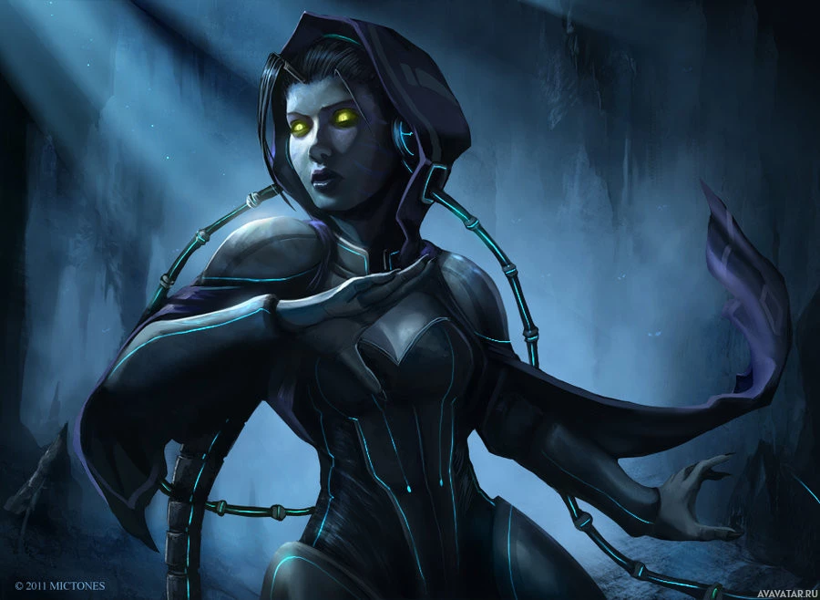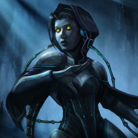a hooded cloak and has a futuristic look with cybernetic or technological elements on her armor and attire. The setting suggests a dark, possibly