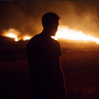 The picture shows a silhouette of a man standing in an open field. There are multiple flares or fires burning in the background, which suggests that this might be a location affected by wildfires or a controlled burn. The overall scene has a dramatic and possibly somber atmosphere due to the darkness and the presence of the fire.