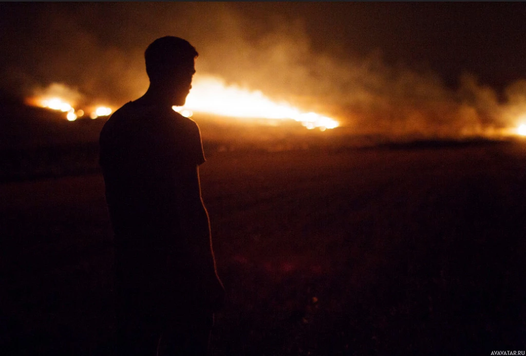 На картине изображен силуэт мужчины, стоящего на открытом поле. На заднем плане горят несколько вспышек или пожаров, что говорит о том, что это может быть место, пострадавшее от лесных пожаров или контролируемого ожога. Общая сцена имеет драматическую и, возможно, мрачную атмосферу из-за темноты и присутствия огня.