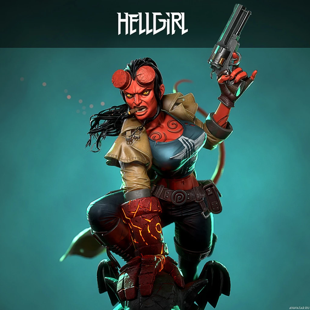 animated character that appears to be Hellgirl. She is depicted holding a gun with one hand and wielding a blade with the other. Her attire includes a cape, boots, and a holster, giving her an adventurous or action-oriented appearance. The background is dark and moody, which could suggest an intense or dangerous setting.