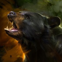 The image shows a bear. It appears to be a close-up portrait with the bear looking directly at the viewer, and it looks like it might be roaring or expressing some