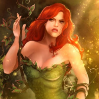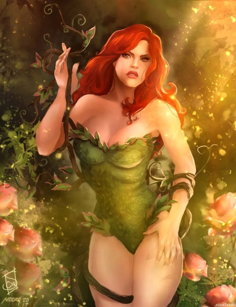 На картинке изображена женщина-персонаж, одетая в зеленый наряд, напоминающий персонажа комиксов «Ядовитый плющ» из серии «Бэтмен». Она имеет рыжие волосы и окружена элементами, которые предполагают волшебную или фантастическую обстановку, такую как цветы и туманный свет.