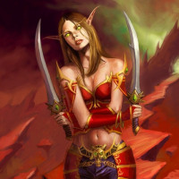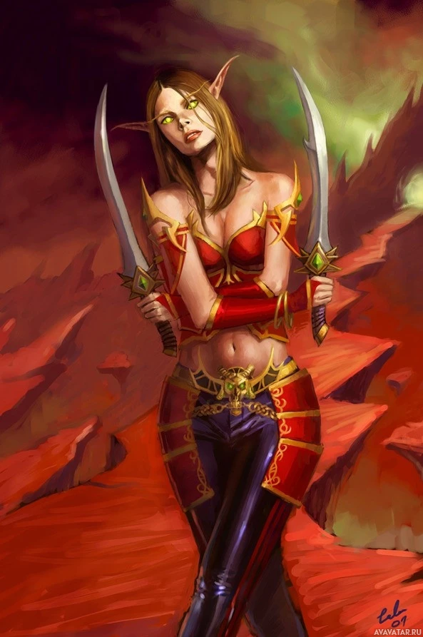 На картинке изображен эльфийский персонаж, одетый в фантастическую одежду. Она держит перед собой два скрещенных меча, и на лице у нее решительное выражение. Фон предполагает вулканическую или огненную среду.