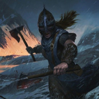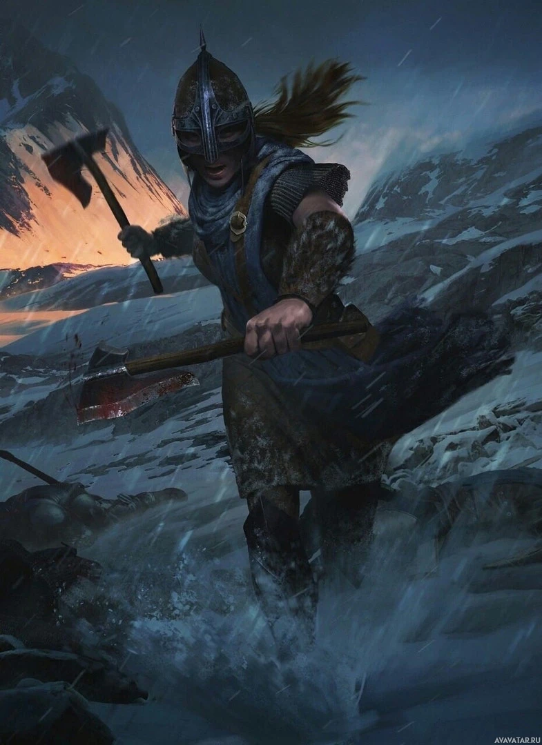 symbols of strength and defense in warrior cultures. The scene around her shows rugged terrain with snow-
