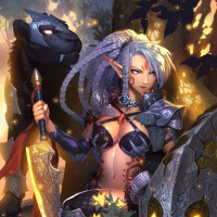 a fantasy character who appears to be an elf. She is holding a sword in her left hand and has
