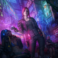 urban environment, possibly a cyberpunk or dystopian cityscape with various signs and advertisements visible around them. In the background, there are other characters that seem to be either spectators or participants in the event.