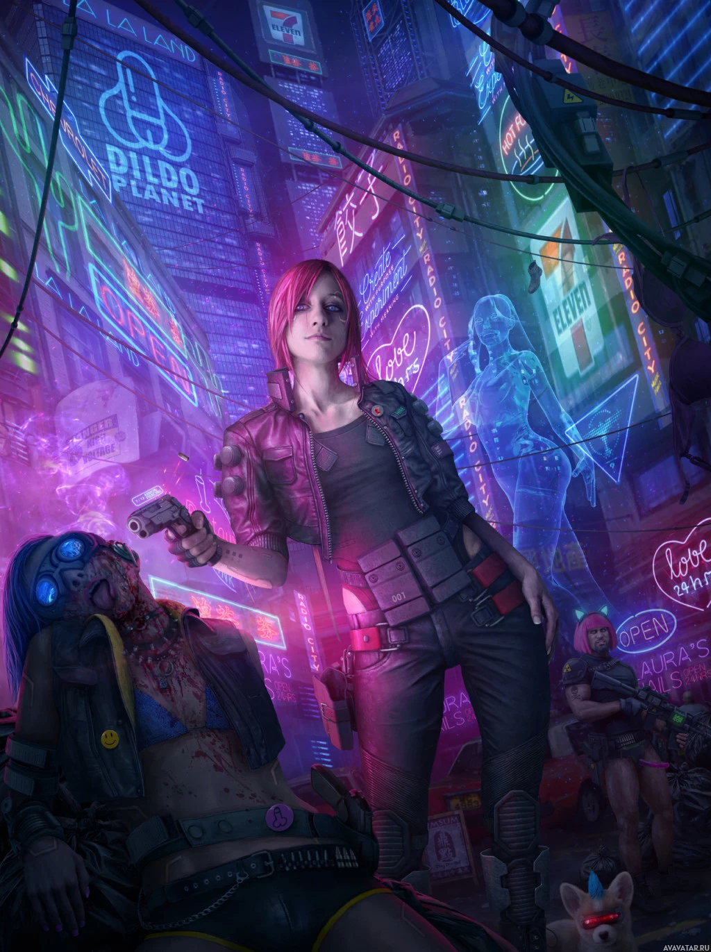 person on the ground, suggesting she might be about to shoot or has just shot someone. The setting appears to be a neon-lit