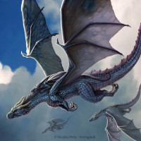The image depicts a fantastical scene with several dragons in flight. There are different styles and sizes of dragons, suggesting a rich mythological or magical theme. These creatures have wings and are soaring through what appears to be a cloudy sky, which adds to the sense of wonder and adventure typically associated with the fantasy genre.