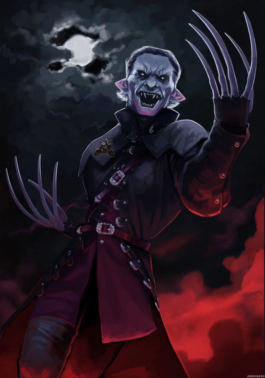 pointed teeth and the fangs that are prominently displayed in the image. The character is shown with a crazed or aggressive expression, and it appears to be set against a dramatic sky background with