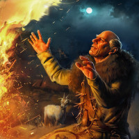 an elemental force. On either side of him are two goats, one brown and one white, adding to the wilderness or fantasy theme. The character is dressed in traditional clothing with a fur-lined cloak, which could suggest he is a wise elder, shaman, or hunter within this