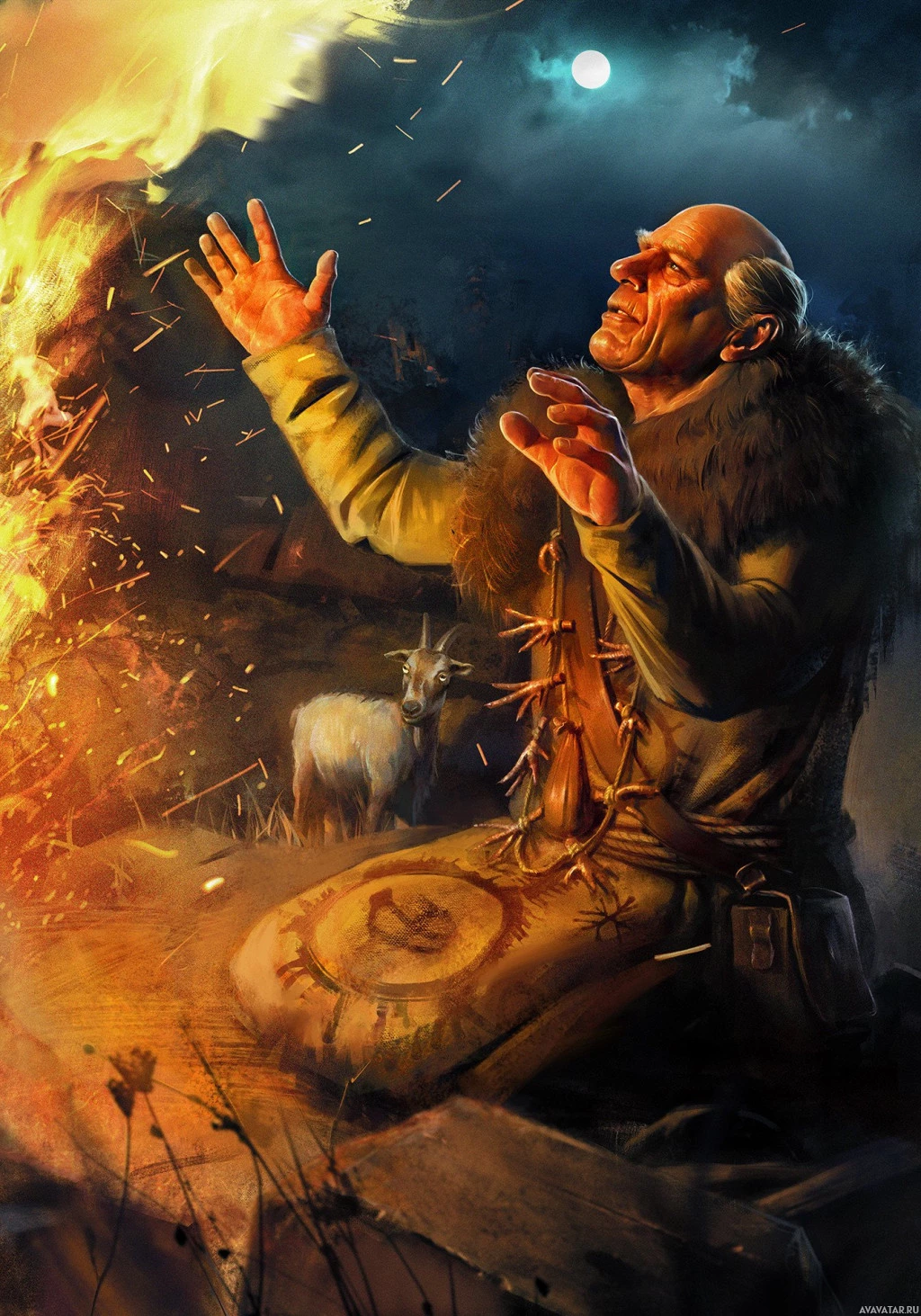 gray hair and a beard. He appears to be in a contemplative or magical state, possibly casting a spell. Behind him are flames that seem to represent a bonfire or