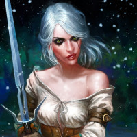 a female character known as Ciri from the video game "The Witcher 3: Wild Hunt." She is dressed in