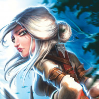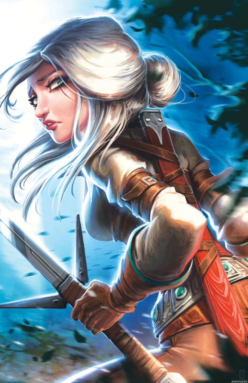 the video game "The Witcher 3: Wild Hunt." She is shown from behind, with her hair flowing in the wind and holding a bow. Her attire suggests she could be a witcher or someone skilled in combat or archery. The background has a blurred appearance that gives