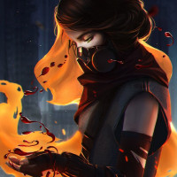 dark colors and elements that resemble flames or fire. The character is depicted with