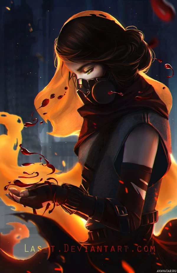 a dynamic energy emanating from behind her, suggesting she might have some kind of power or ability related to fire or heat. Her outfit has a somewhat gothic or edgy design with