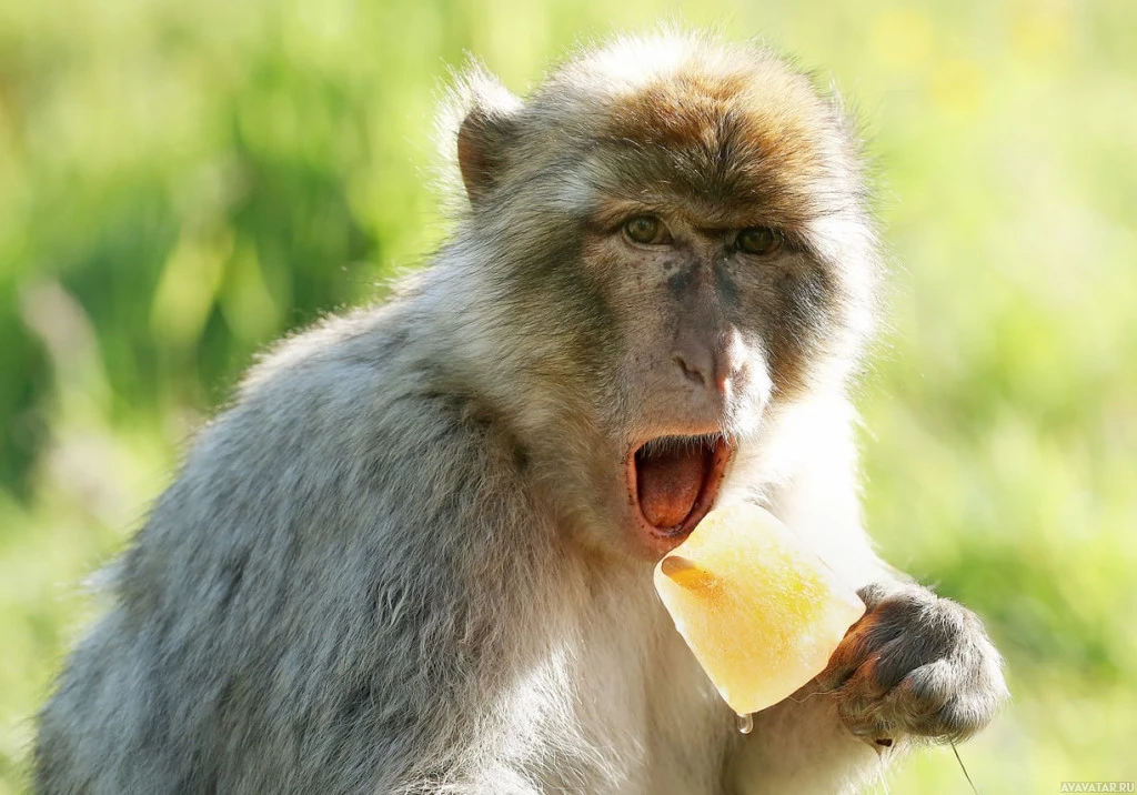 an outdoor environment with greenery in the background. The monkey is looking directly at the camera and seems to have something in its hand, possibly food or a leaf it's holding. This photo captures a moment of the monkey's natural behavior in what might be its