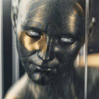 The image shows a person with their face obscured by what appears to be a mask or a reflective surface, creating an impression of multiple faces. It's set against a backdrop that looks like digital screens or panels. This kind of imagery can evoke themes of identity, technology, and the nature of perception.
