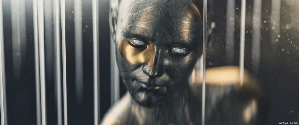 Картинка показывает человека с его лицом, затененным тем, что кажется маской или отражающей поверхностью, создавая впечатление нескольких лиц. Он установлен на фоне, который выглядит как цифровые экраны или панели. Такие образы могут вызывать темы идентичности, технологии и природы восприятия.