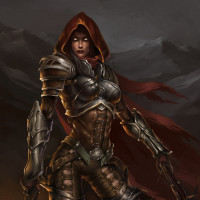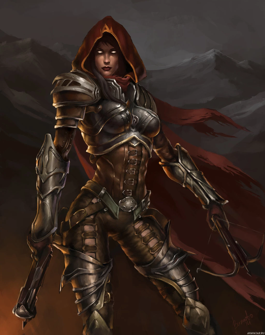 typical weapons for this class in the game. They also have a hood on their head, likely to represent their role as an archer who can blend into shadows and strike from afar. The background suggests a dark, possibly
