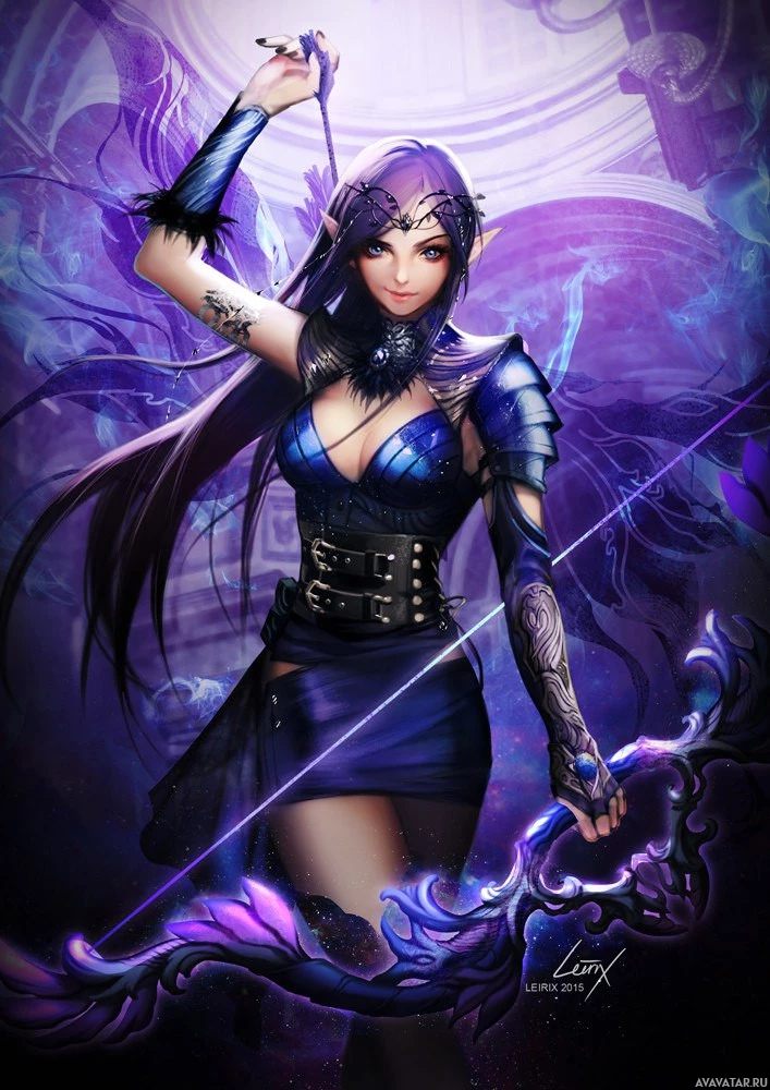 purple hair and is wearing a fantasy-themed outfit with elements of armor and bow, suggesting she might be a warrior or archer in her setting. The background has mystical or magical elements, enhancing